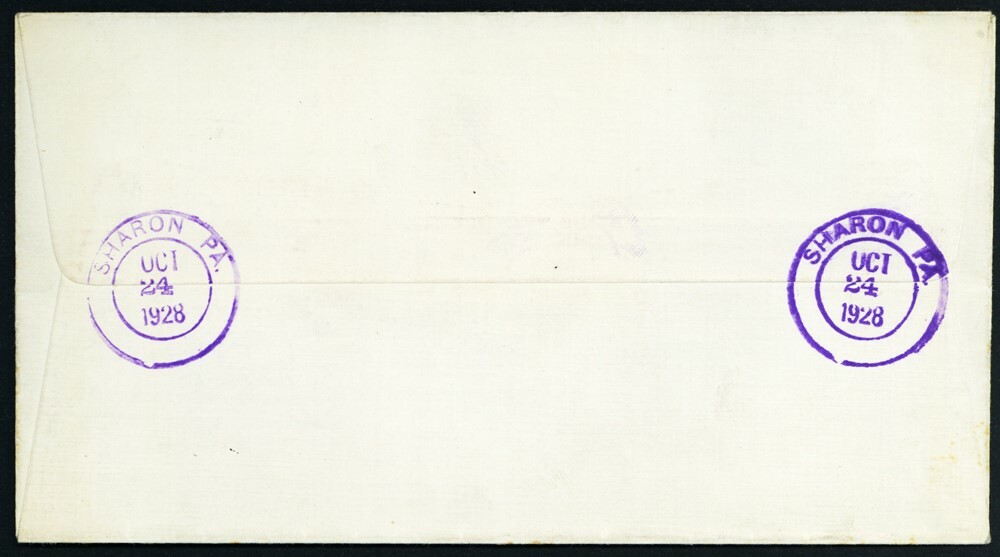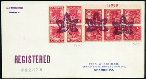1928, Sharon, Pa., "REG in Maple Leaf" fancy cancel, registered cover (Loso-deWindt 1060), tied by three bold strikes of purple Leaf cancels, on registered cover from Sharon, Pa., Oct. 24, 1928, local use, scarce and desirable fancy cancel, attractive design, well franked registered cover, Very Fine, reportedly used Oct. 20, 1928 to Oct. 24, 1928. Scott 643 (plate block of 6), 645 (block of 4).