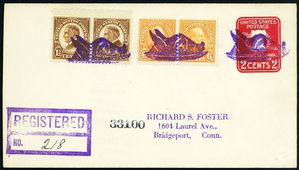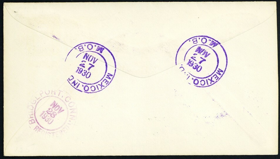 [Indiana] Mexico, Roasted Turkey in purple, three choice strikes tie 15¢ postage on a 2¢ entire sent Registered on Thanksgiving Day, Nov, 27, 1930, to R.S. Foster in Bridgeport, Ct., Very Fine.