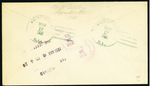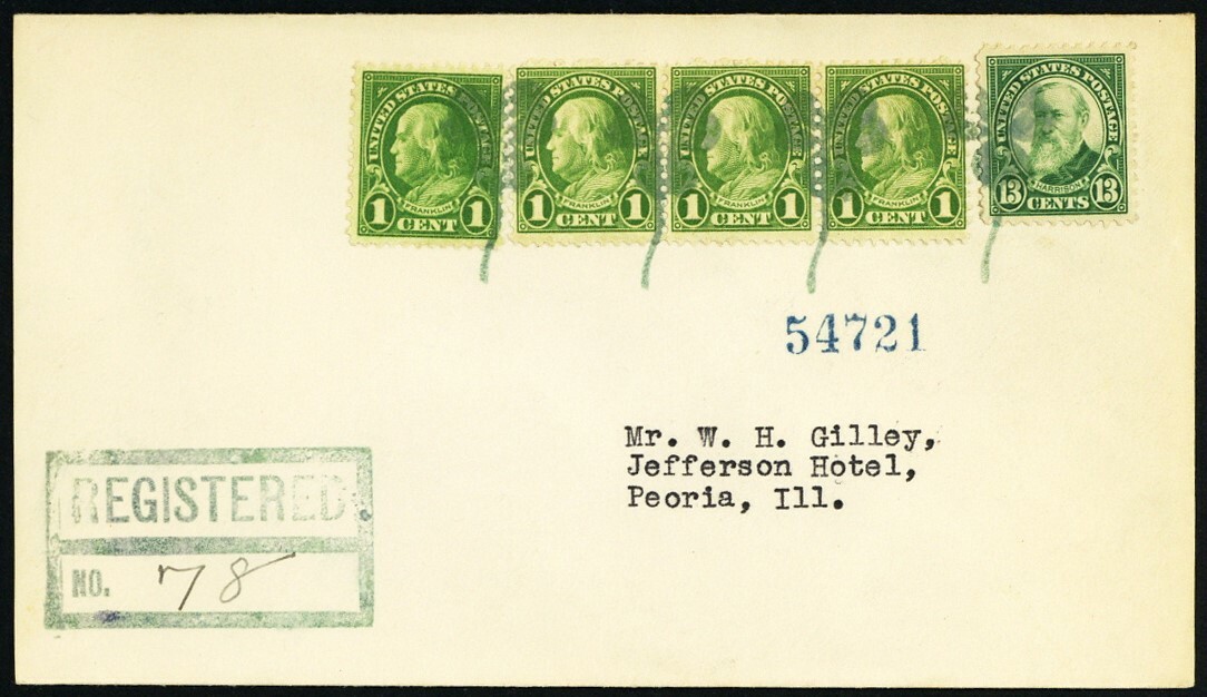 [Illinois] Bondville, Shamrock in green, five nice strikes tie 17¢ postage a 1931 St. Patrick's Day Registered cover from W.H. Gilley to himself in Peoria, Ill., Very Fine. The only date of use. Loso - deWindt 85.