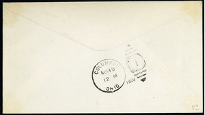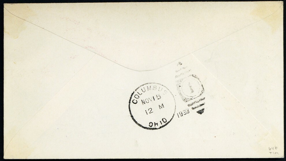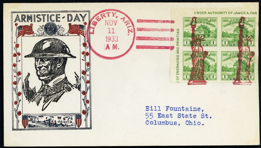 [Arizona] Liberty, Statue of Liberty in red, two nice strike, with an Armistice Day, Nov 11, 1933, duplex handstamp alongside, ties a block of 4 of imperf 1¢ Century of Progress commemoratives on a cover to W.G. Fountaine in Columbus, O., with an attractive red & black "Armistice-Day" cachet, Very Fine.