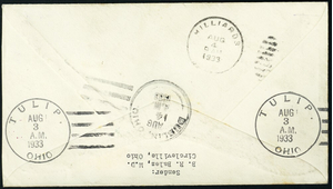 [Ohio] Tulip, Tulip on a Stem in magenta, three perfect strikes tie 16¢ postage on a 2¢ Sesquicentennial entire sent Registered from the cancel's designer, Dr. B.R. Bales, to W.G. Fountaine in Dublin, O. bearing a matching Aug 2, 1933 c.d.s. on the front and two additional black Aug 3 Tulip c.d.s.s on the reverse, Fine to Very Fine. Loso-deWindt 1178.