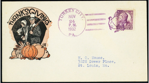 [Pennsylvania] Turkey City, Turkey in purple, perfect strike, with a matching Thanksgiving Day, Nov 24, 1932 duplex handstamp alongside, ties a 3¢ Daniel Webster commemorative on a cover to H.O. Nouss in St. Louis, with an attractive 2-color "Thanksgiving" cachet, Very Fine. Used only on Thanksgiving Day, 1932 and 1933.