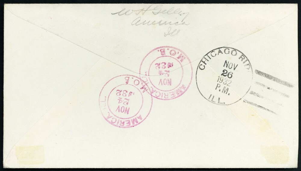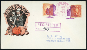 [Illinois] America, Turkey in purple, two choice strikes with a magenta Thanksgiving Day, Nov 24, 1932, America "M.O.B." c.d.s. alongside, tie 18¢ postage on a Registered cover from W.H. Gilley to R.P. Gilley in Chicago Ridge, Ill. with a pretty Pictorial "Thanksgiving" cachet, Very Fine.