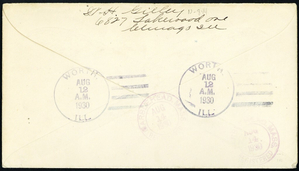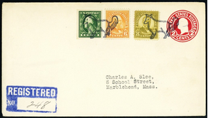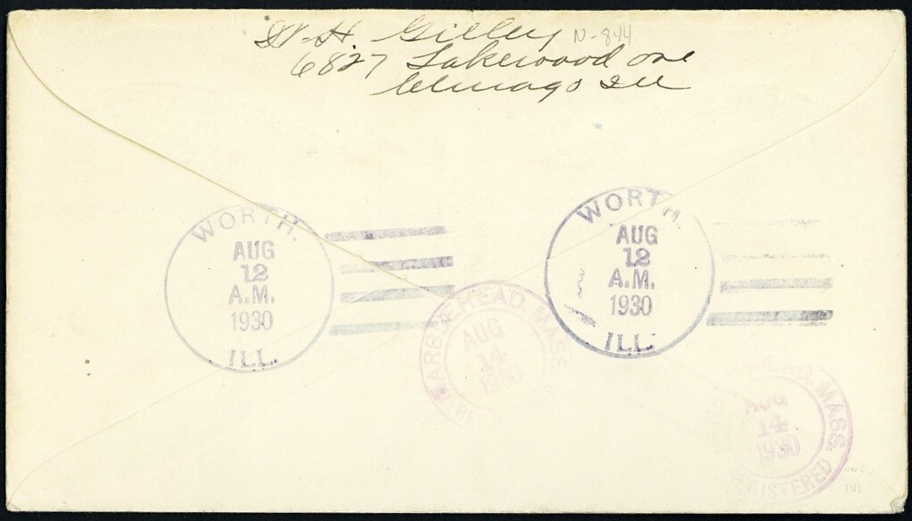 [Illinois] Worth, Fox, two choice strikes, tie 15¢ postage and cancel the indicia on a 2¢ entire sent Registered on Aug 12, 1930, from W.H. Gilley to Highland, Ind., Very Fine. Six days before Loso & deWindt's only recorded date of use.