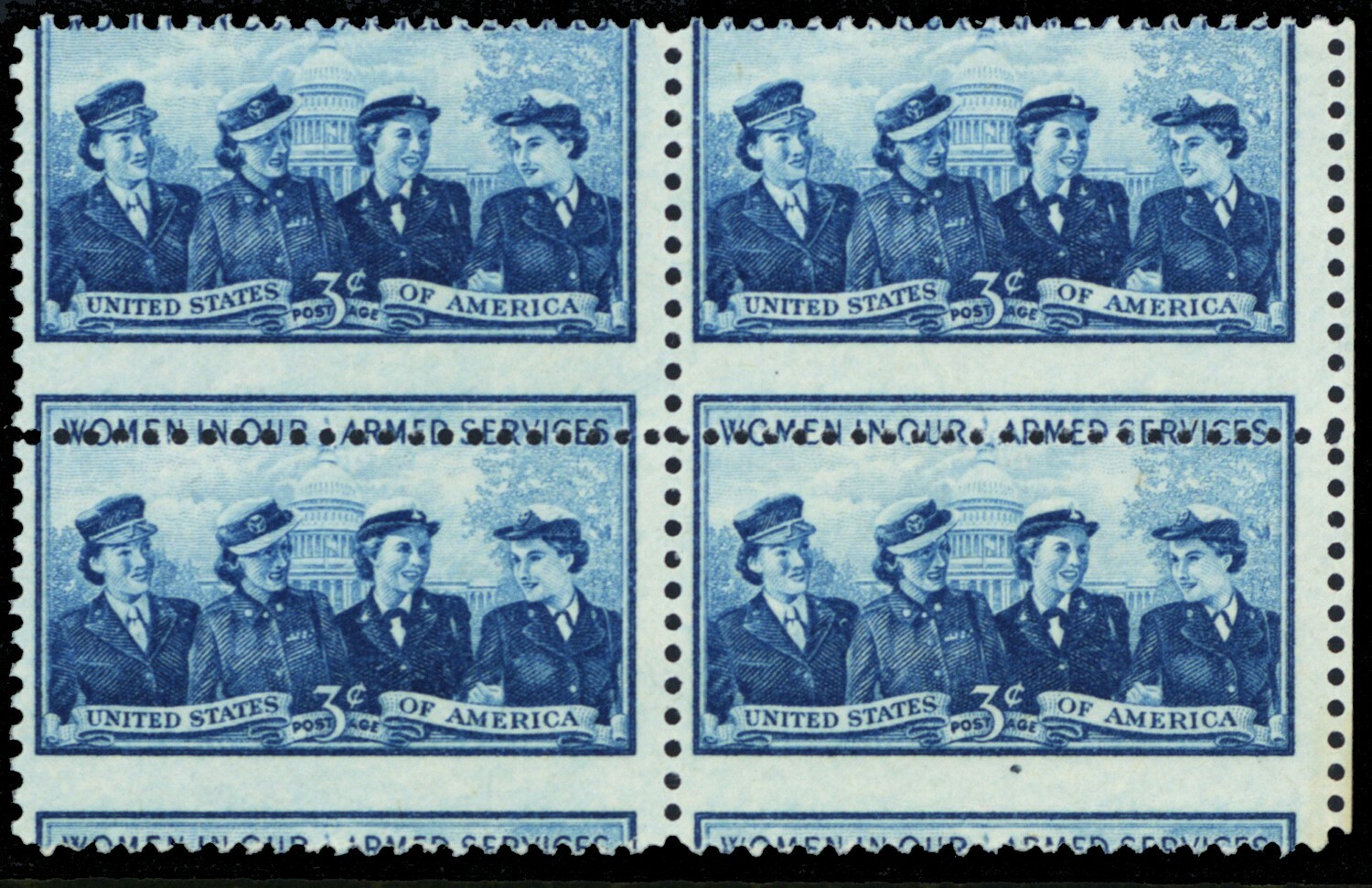 1013, Mint NH 3¢ Misperfed Freak Error Block of Four * Stuart Katz