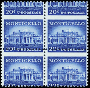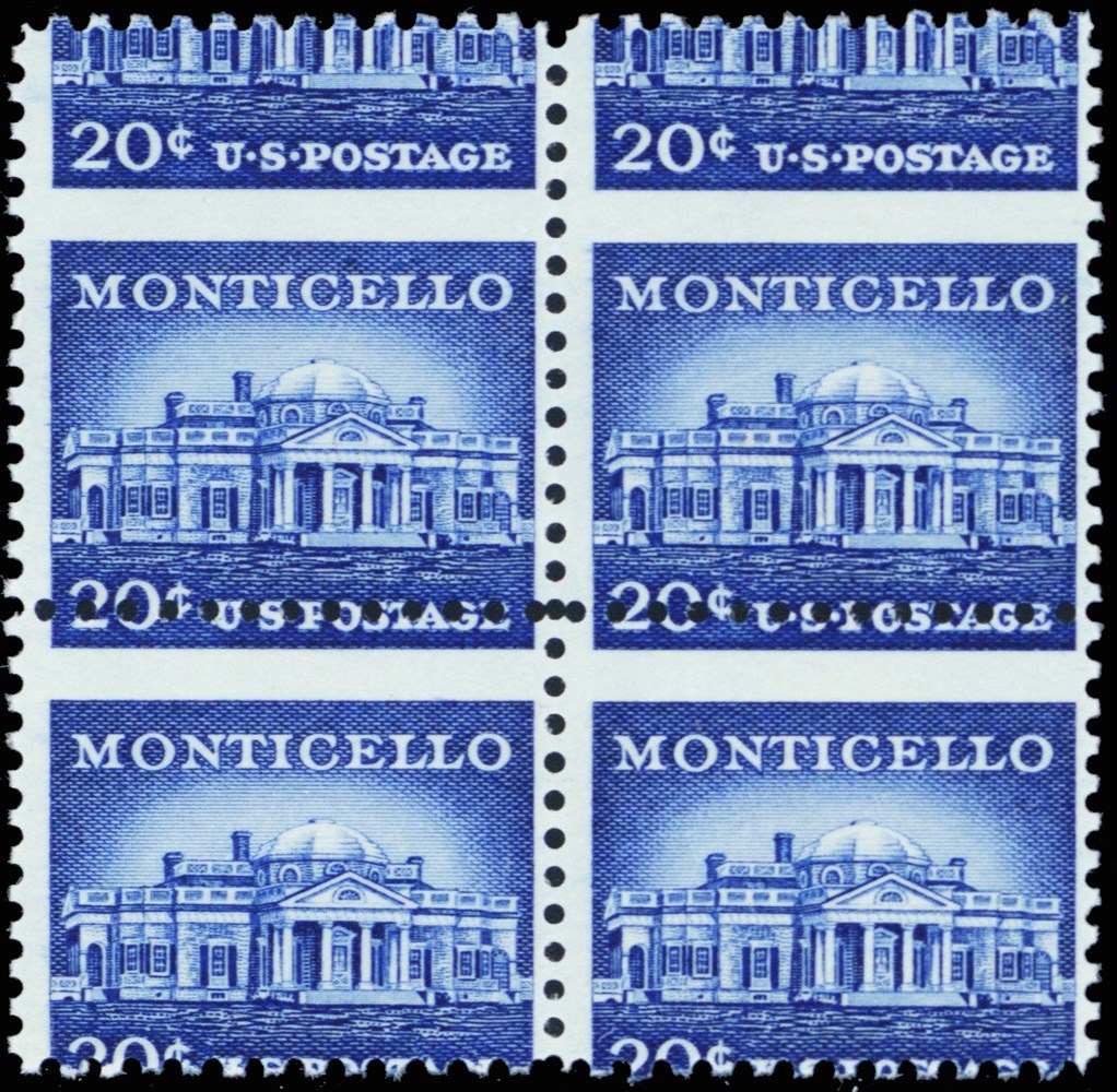 1047, 20¢ Monticello Misplaced Pins Misperfed ERROR Block - Stuart Katz