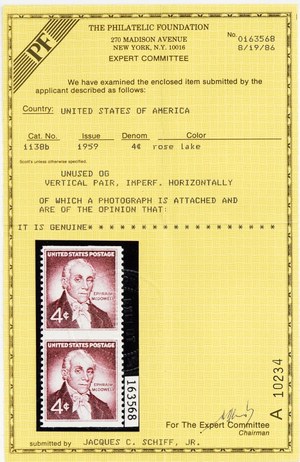 Due to the high cost of obtaining certificates we will only refund the cost of the stamp and not the cost of the certificate for stamps that sell for less than $250 that come back with a negative certificate. Stamps that sell for above $250 will receive a full refund for both the price of the stamp and cost of the certificate if it should come back not as described. For U.S. stamps only certificates from either APS, PSE or from the Philatelic Foundation are accepted, however "graded" certificates or "encased" items are not accepted.