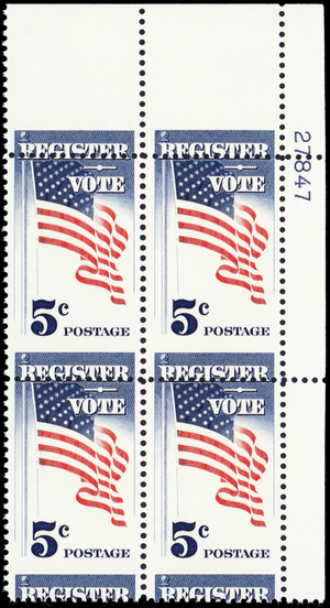 1249, Mint NH 5¢ Misperforated Error Plate Block Register to Vote - Stuart Katz