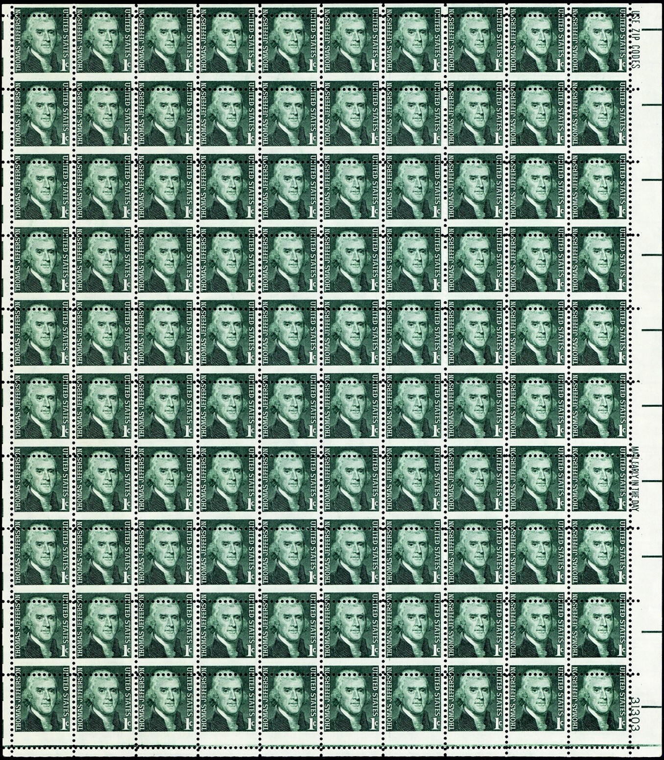 1278, MNH 1¢ Very RARE Misperfed Sheet of 100 Stamps Freaky Error - Stuart Katz