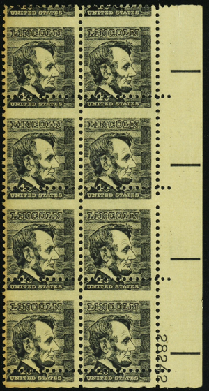 1282, Mint NH 4¢ Lincoln Misperfed Plate Block of 8 Freaky Error * Stuart Katz