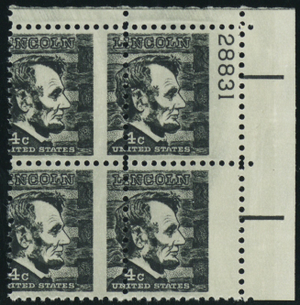 1282, MNH 4¢ Lincoln Freak Error Plate Block of Four PL# Captured - Stuart Katz