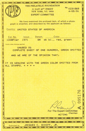 Due to the high cost of obtaining certificates we will only refund the cost of the stamp and not the cost of the certificate for stamps that sell for less than $250 that come back with a negative certificate. Stamps that sell for above $250 will receive a full refund for both the price of the stamp and cost of the certificate if it should come back not as described. For U.S. stamps only certificates from either APS, PSE or from the Philatelic Foundation are accepted, however "graded" certificates or "encased" items are not accepted.