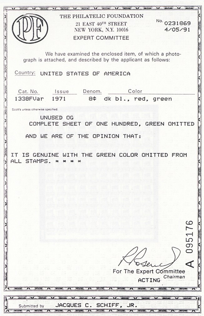 1338Fp, MNH 8¢ Green Slate Color Omitted Major Error With PFC Cert Stuart Katz