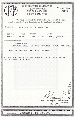 Due to the high cost of obtaining certificates we will only refund the cost of the stamp and not the cost of the certificate for stamps that sell for less than $250 that come back with a negative certificate. Stamps that sell for above $250 will receive a full refund for both the price of the stamp and cost of the certificate if it should come back not as described. For U.S. stamps only certificates from either APS, PSE or from the Philatelic Foundation are accepted, however "graded" certificates or "encased" items are not accepted.