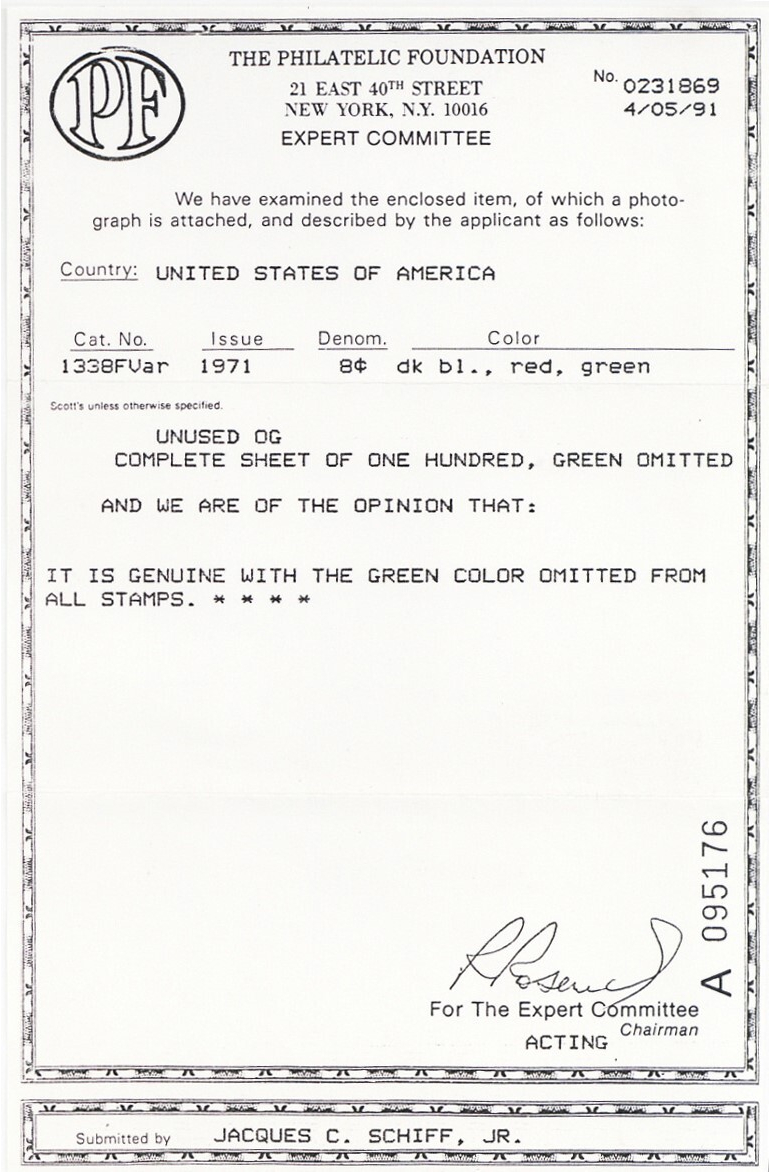 1338Fp, MNH 8¢ Green Slate Color Omitted Major Error With PFC Cert - Stuart Katz