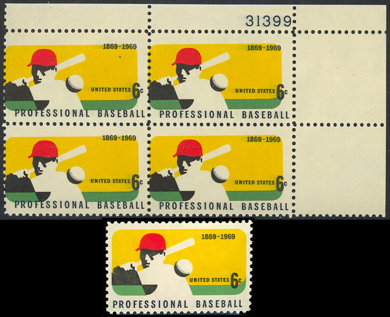 1381 Multi Color Shift ERROR PL# Block of Four 6¢ Baseball - Stuart Katz