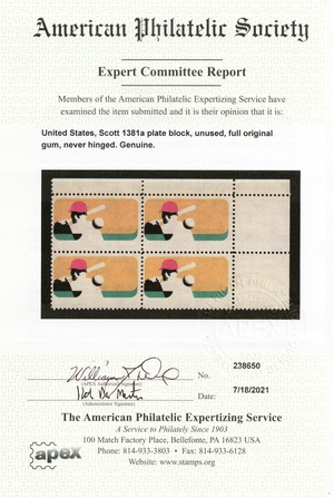 1381a, MNH 6¢ Black Color Omitted Plate Block APS Cert - Stuart Katz
