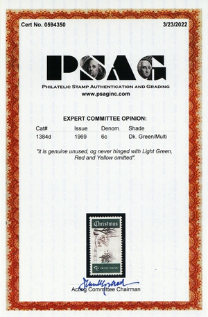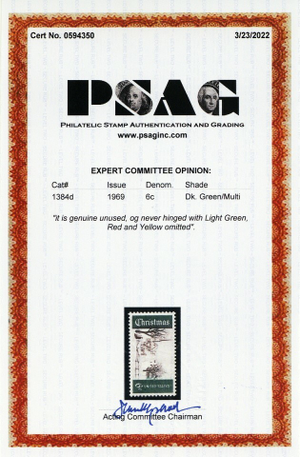 Due to the high cost of obtaining certificates we will only refund the cost of the stamp and not the cost of the certificate for stamps that sell for less than $250 that come back with a negative certificate. Stamps that sell for above $250 will receive a full refund for both the price of the stamp and cost of the certificate if it should come back not as described. For U.S. stamps only certificates from either APS, PSE or from the Philatelic Foundation are accepted, however "graded" certificates or "encased" items are not accepted.
