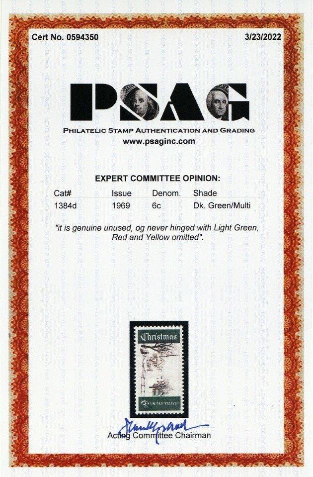 1384D, MNH 6¢ With Three Colors Omitted MAJOR ERROR With Certificate Stuart Katz