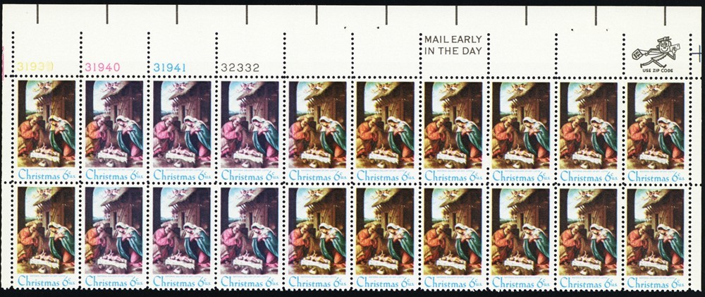 1414b, MNH 6¢ Black Color Missing in PL# Block of 20 Stamps - Stuart Katz