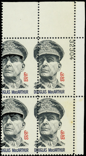 1424, MNH 6¢ McArthur Misperfed Error Plate Block PL# Captured - Stuart Katz