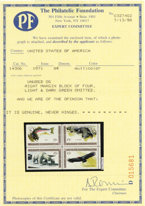 Due to the high cost of obtaining certificates we will only refund the cost of the stamp and not the cost of the certificate for stamps that sell for less than $250 that come back with a negative certificate. Stamps that sell for above $250 will receive a full refund for both the price of the stamp and cost of the certificate if it should come back not as described. For U.S. stamps only certificates from either APS, PSE or from the Philatelic Foundation are accepted, however "graded" certificates or "encased" items are not accepted.