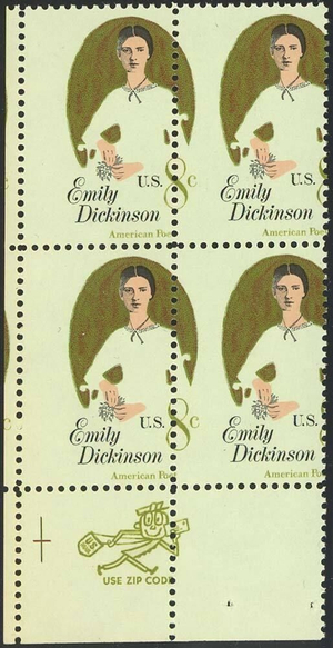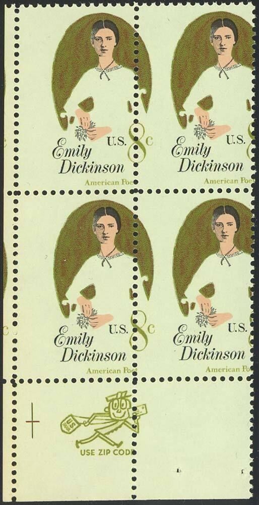 1436, 8¢ MISPERFED ERROR ZIP BLOCK - EMILY DICKINSON