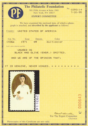 Due to the high cost of obtaining certificates we will only refund the cost of the stamp and not the cost of the certificate for stamps that sell for less than $250 that come back with a negative certificate. Stamps that sell for above $250 will receive a full refund for both the price of the stamp and cost of the certificate if it should come back not as described. For U.S. stamps only certificates from either APS, PSE or from the Philatelic Foundation are accepted, however "graded" certificates or "encased" items are not accepted.