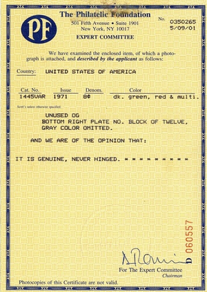 Due to the high cost of obtaining certificates we will only refund the cost of the stamp and not the cost of the certificate for stamps that sell for less than $250 that come back with a negative certificate. Stamps that sell for above $250 will receive a full refund for both the price of the stamp and cost of the certificate if it should come back not as described. For U.S. stamps only certificates from either APS, PSE or from the Philatelic Foundation are accepted, however "graded" certificates or "encased" items are not accepted.