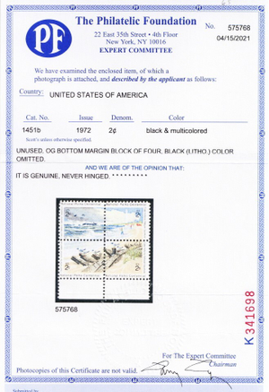 1451b, MNH 2¢ Black Color Omitted Block of Four Stamps PFC Cert - Stuart Katz