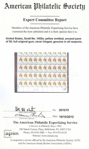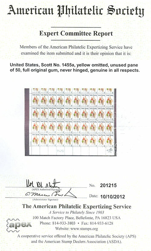 1455a Yellow Color Omitted MAJOR ERROR With APS Certificate MNH - Stuart Katz