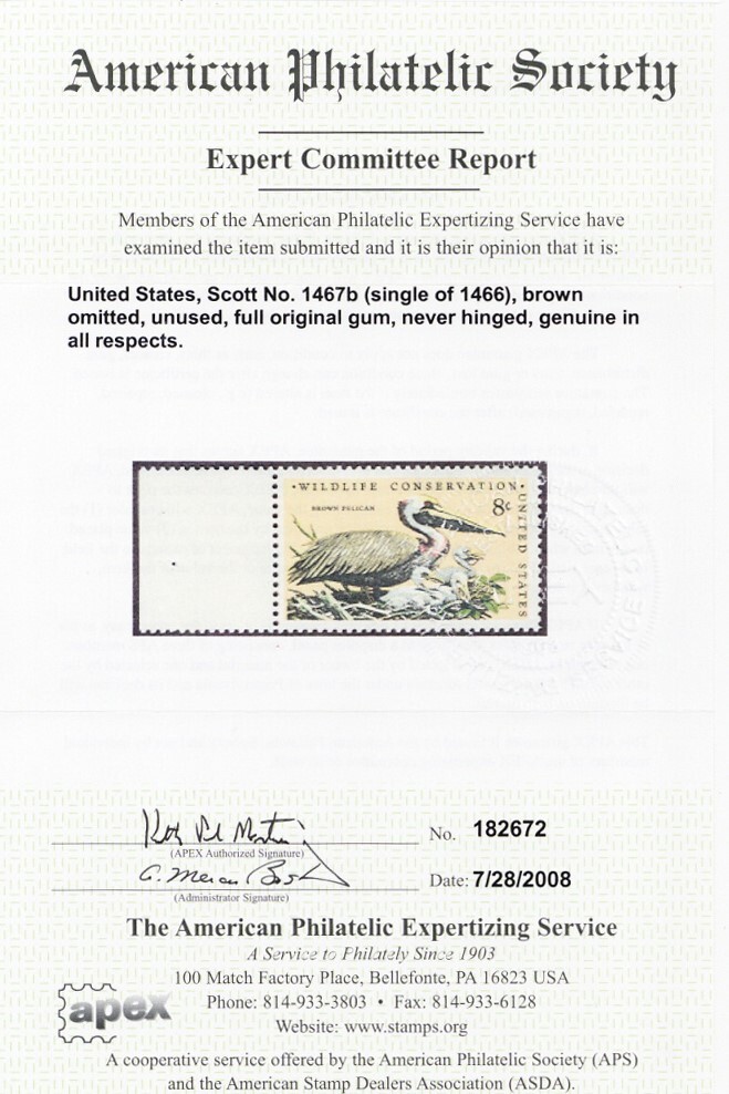 1466b, Mint NH VF 8¢ Brown Color Omitted RARE Error APS Cert- Stuart Katz