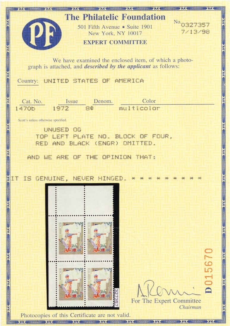 1470b, Mint VF NH 8¢ - Red & Black Colors Omitted Plate Block PFC - Stuart Katz