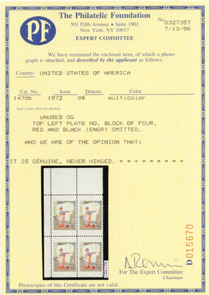 Due to the high cost of obtaining certificates we will only refund the cost of the stamp and not the cost of the certificate for stamps that sell for less than $250 that come back with a negative certificate. Stamps that sell for above $250 will receive a full refund for both the price of the stamp and cost of the certificate if it should come back not as described. For U.S. stamps only certificates from either APS, PSE or from the Philatelic Foundation are accepted, however "graded" certificates or "encased" items are not accepted.