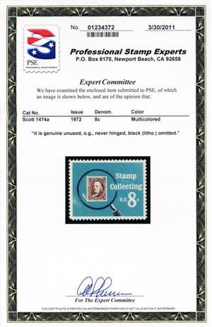 Due to the high cost of obtaining certificates we will only refund the cost of the stamp and not the cost of the certificate for stamps that sell for less than $250 that come back with a negative certificate. Stamps that sell for above $250 will receive a full refund for both the price of the stamp and cost of the certificate if it should come back not as described. For U.S. stamps only certificates from either APS, PSE or from the Philatelic Foundation are accepted, however "graded" certificates or "encased" items are not accepted.