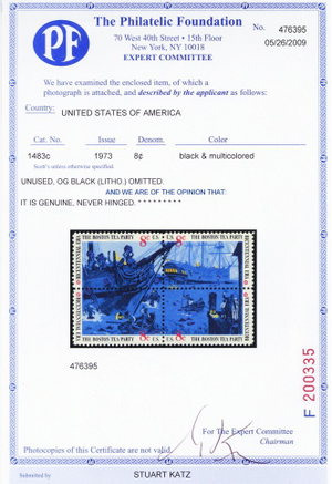 Due to the high cost of obtaining certificates we will only refund the cost of the stamp and not the cost of the certificate for stamps that sell for less than $250 that come back with a negative certificate. Stamps that sell for above $250 will receive a full refund for both the price of the stamp and cost of the certificate if it should come back not as described. For U.S. stamps only certificates from either APS, PSE or from the Philatelic Foundation are accepted, however "graded" certificates or "encased" items are not accepted.