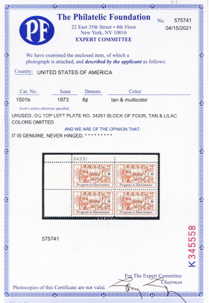 1501b, MNH 8¢ Tan & Lilac Colors Omitted Error Plate Block PFC Cert- Stuart Katz