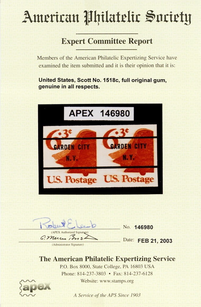 1518c, MNH XF Imperforate Pair Error - Garden City, NY Precancel APS Cert