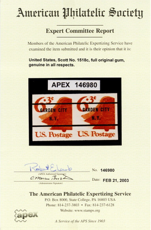 Due to the high cost of obtaining certificates we will only refund the cost of the stamp and not the cost of the certificate for stamps that sell for less than $250 that come back with a negative certificate. Stamps that sell for above $250 will receive a full refund for both the price of the stamp and cost of the certificate if it should come back not as described. For U.S. stamps only certificates from either APS, PSE or from the Philatelic Foundation are accepted, however "graded" certificates or "encased" items are not accepted.