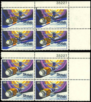 1529, 10¢ SKYLAB - BLACK COLOR SHIFTED WAY UP MAJOR ERROR PLATE BLOCK