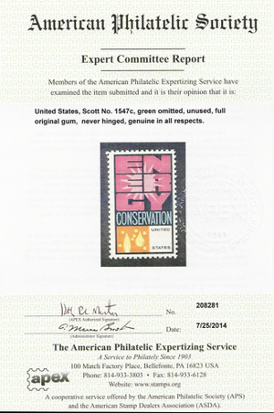 Due to the high cost of obtaining certificates we will only refund the cost of the stamp and not the cost of the certificate for stamps that sell for less than $250 that come back with a negative certificate. Stamps that sell for above $250 will receive a full refund for both the price of the stamp and cost of the certificate if it should come back not as described. For U.S. stamps only certificates from either APS, PSE or from the Philatelic Foundation are accepted, however "graded" certificates or "encased" items are not accepted.