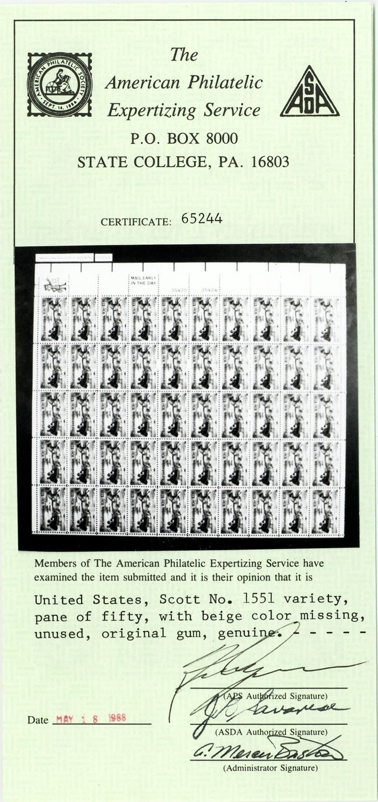 1551a, Buff Color Omitted Sheet of 50 Stamps APS Cert CV $625 -Stuart Katz