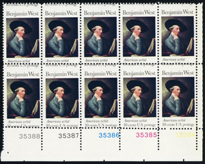 1553, Misperfed ERROR Plate Block of 10 10¢ Benjamin West Stamps - Stuart Katz