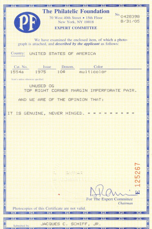 Due to the high cost of obtaining certificates we will only refund the cost of the stamp and not the cost of the certificate for stamps that sell for less than $250 that come back with a negative certificate. Stamps that sell for above $250 will receive a full refund for both the price of the stamp and cost of the certificate if it should come back not as described. For U.S. stamps only certificates from either APS, PSE or from the Philatelic Foundation are accepted, however "graded" certificates or "encased" items are not accepted.