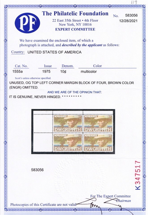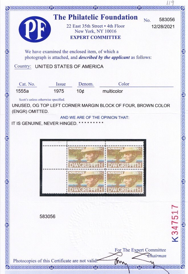 1555a, MNH Margin Block - Brown Color Omitted PFC Certificate - Stuart Katz