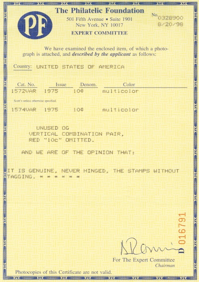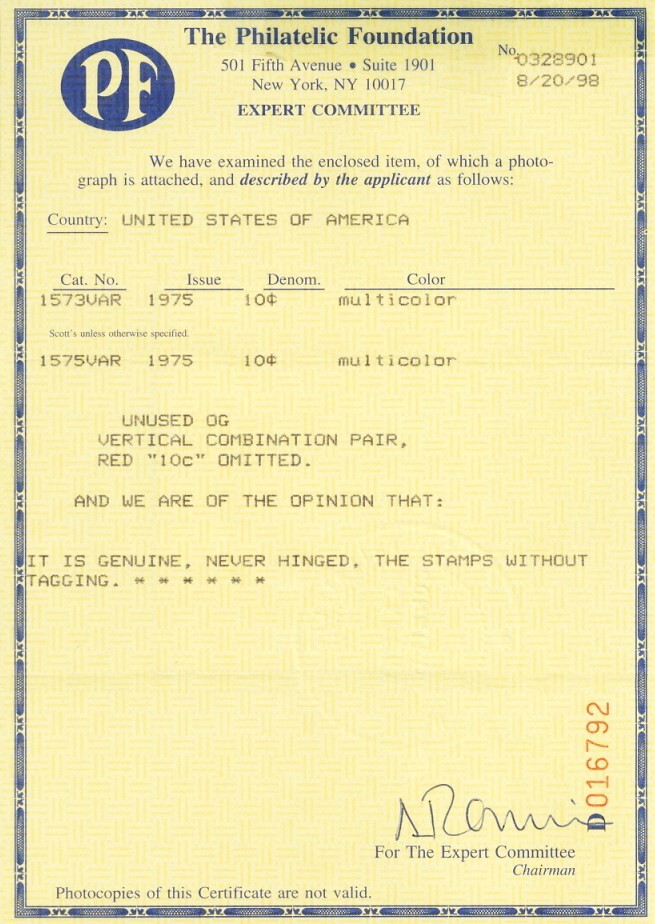 Due to the high cost of obtaining certificates we will only refund the cost of the stamp and not the cost of the certificate for stamps that sell for less than $250 that come back with a negative certificate. Stamps that sell for above $250 will receive a full refund for both the price of the stamp and cost of the certificate if it should come back not as described. For U.S. stamps only certificates from either APS, PSE or from the Philatelic Foundation are accepted, however "graded" certificates or "encased" items are not accepted.