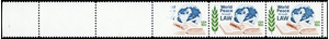 1975, 10¢ World Peace Through Law, all colors omitted (Scott 1576c) The first two stamps in a transitional strip of 5, the middle stamp only partially printed