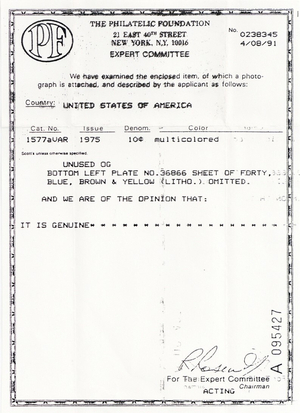 Due to the high cost of obtaining certificates we will only refund the cost of the stamp and not the cost of the certificate for stamps that sell for less than $250 that come back with a negative certificate. Stamps that sell for above $250 will receive a full refund for both the price of the stamp and cost of the certificate if it should come back not as described. For U.S. stamps only certificates from either APS, PSE or from the Philatelic Foundation are accepted, however "graded" certificates or "encased" items are not accepted.