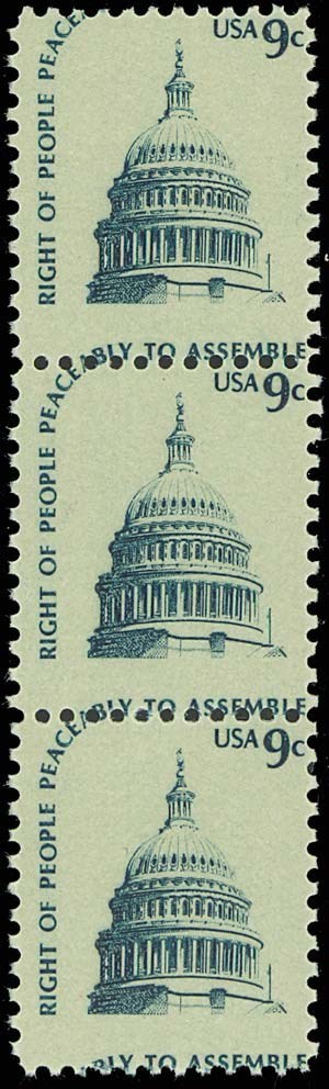 1591, MNH 9¢ U.S. Capital Misperforation ERROR Strip of 3 Stamps - Stuart Katz