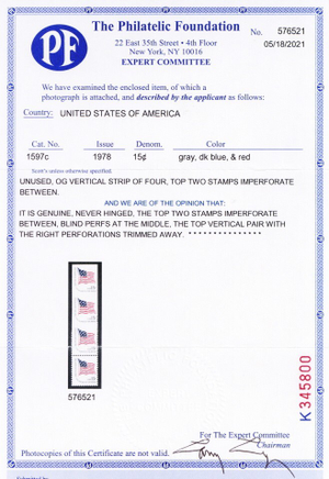 Due to the high cost of obtaining certificates we will only refund the cost of the stamp and not the cost of the certificate for stamps that sell for less than $250 that come back with a negative certificate. Stamps that sell for above $250 will receive a full refund for both the price of the stamp and cost of the certificate if it should come back not as described. For U.S. stamps only certificates from either APS, PSE or from the Philatelic Foundation are accepted, however "graded" certificates or "encased" items are not accepted.